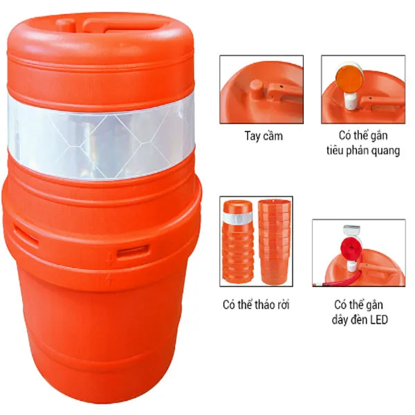 Thùng giảm chấn PE với đường kính 500mm và chiều cao 800mm, dạng rỗng tháo rời, được sản xuất tại Korea. Sản phẩm này giúp giảm chấn hiệu quả trong các tình huống giao thông, dễ dàng lắp ráp và tháo rời khi cần thiết.